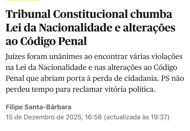 2025 年 12 月 15 日,葡萄牙宪法法院作出预防性合宪性裁决,认定新近通过的《国籍法》中的若干关键条款违反宪法。因此,该法律无法以现行文本生效,并将被送回共和国总统,由总统行使否决权并转回议会重新审议。