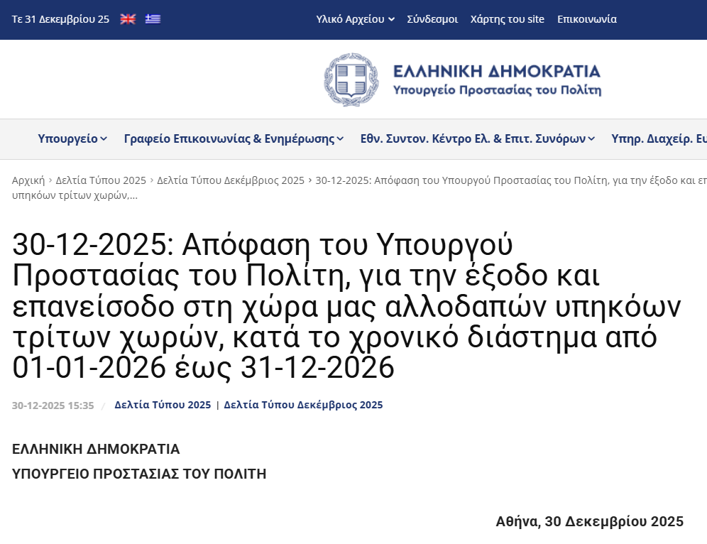2025年12月30日:公民保护部长关于2026年1月1日至2026年12月31日期间外国第三国国民出入境的决定