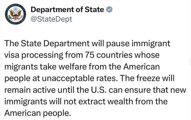 美国国务院宣布无限期暂停受理75个国家公民的移民签证申请。该措施将于2026年1月21日生效。