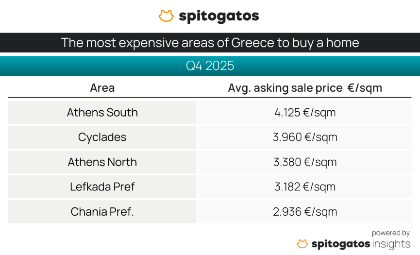 雅典南部郊区仍然是希腊住宅买卖和租赁价格最高的地区。平均要价达到每平方米4,125欧元。房屋购买平均要价最高的五个地区分别是基克拉泽斯群岛、雅典北部郊区以及莱夫卡达和哈尼亚地区。