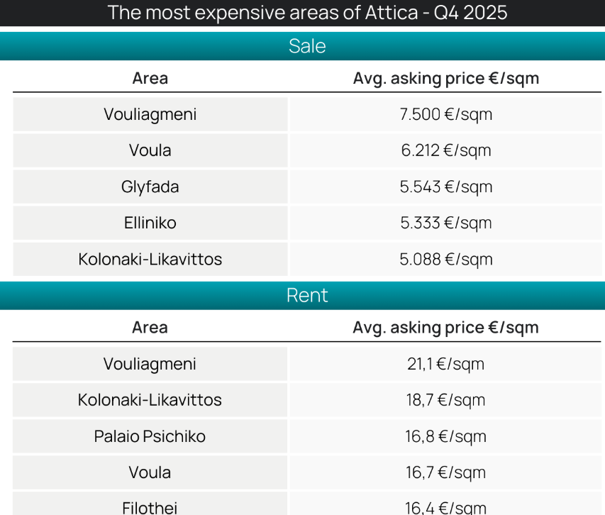 2025年第四季度,沃利亚格梅尼仍是阿提卡地区最贵的地区,平均要价为每平方米7,500欧元,平均租金为每平方米21.1欧元。其他高端地区包括沃拉、格利法达、埃利尼科以及科隆纳基-利卡维托斯区。
