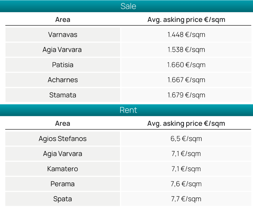 在阿提卡地区,房价最实惠的地区是瓦尔纳瓦斯、阿吉亚瓦尔瓦拉、帕蒂西亚、阿查内斯和斯塔马塔。另一方面,房屋租赁平均要价最低的地区是阿吉奥斯·斯特凡诺斯、阿吉亚瓦尔瓦拉、卡马特罗、比雷埃夫斯和斯帕塔。