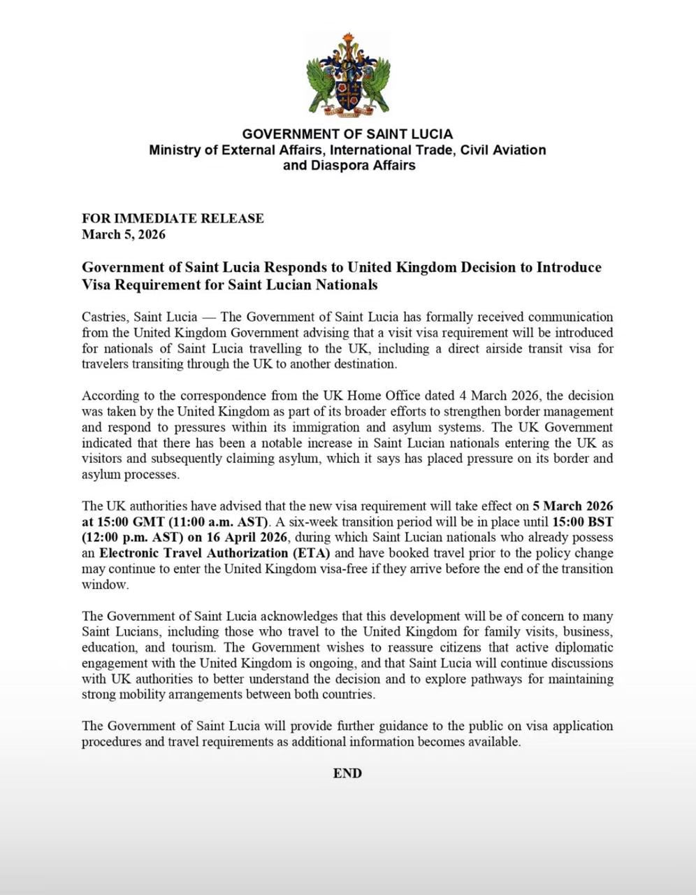 圣卢西亚政府认识到,许多圣卢西亚人,包括到英国探亲、经商、受教育和旅游的人,都将关注这一事态发展。政府向公民保证,圣卢西亚正在与英国进行积极的外交接触,圣卢西亚将继续与英国当局进行讨论,以更好地理解这一决定,并探索保持两国之间强有力的流动安排的途径。