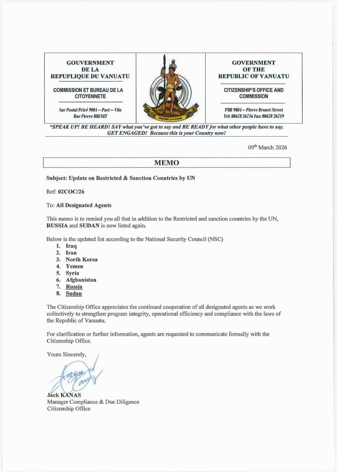 2026年3月09日瓦努阿图投资入籍最新政策,被禁止申请瓦努阿图护照的国家列表更新: