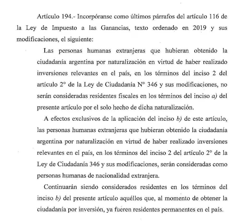 该法案草案第一段规定,“根据第346号公民法及其修正案的定义,通过在阿根廷进行重大投资而入籍获得阿根廷公民身份的外国个人,仅凭其入籍本身,不会被视为本条(a)款规定的税务居民。”