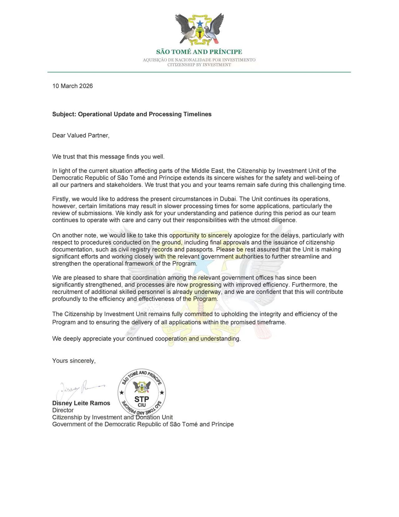 受当前中东(特别是迪拜)局势影响,圣多美和普林西比投资入籍部门CIU虽然持续运作,但申请处理速度(尤其是审核环节)可能会有所放缓。当局就近期出现的延误,特别是最终批准、民事登记和护照签发等环节的延迟,正式致歉。当局已显著加强相关政府办公室之间的协调,流程效率正在提升,正在招聘更多专业人员,以增强计划的执行效率。重申将致力于维护项目的完整性和效率,确保在承诺的时间内完成申请处理。