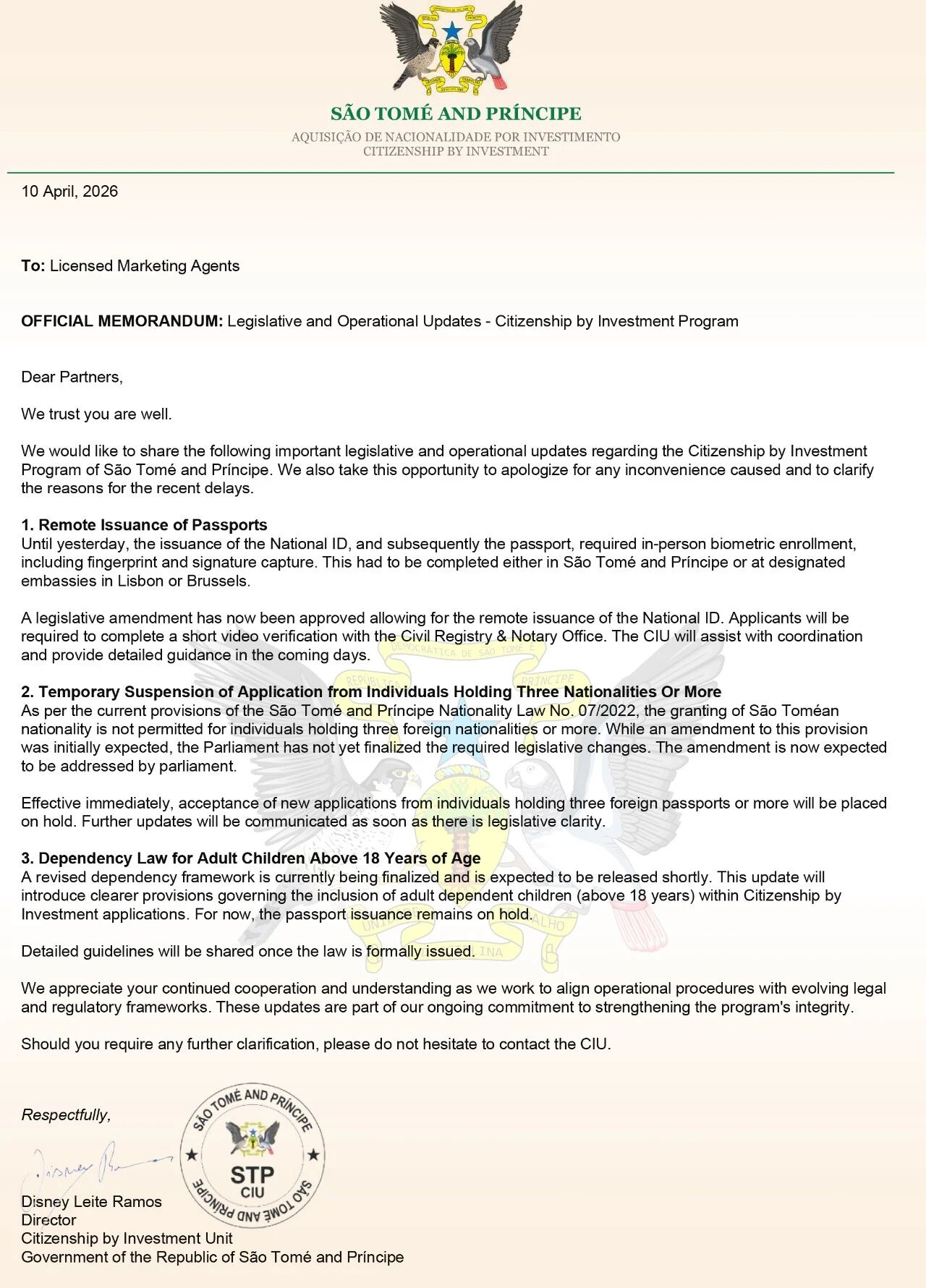 2026年4月10日,圣多美和普林西比投资入籍单位(CIU)正式发布最新官方备忘录,针对该国投资公民身份项目,公布了立法及运营层面的最新调整,同时也对近期申请流程出现的延迟进行了说明和致歉。此次政策变动直接关系到护照办理流程、申请资格认定,每一条都和申请人息息相关,下面为大家逐一清晰解读,帮您快速掌握核心内容。